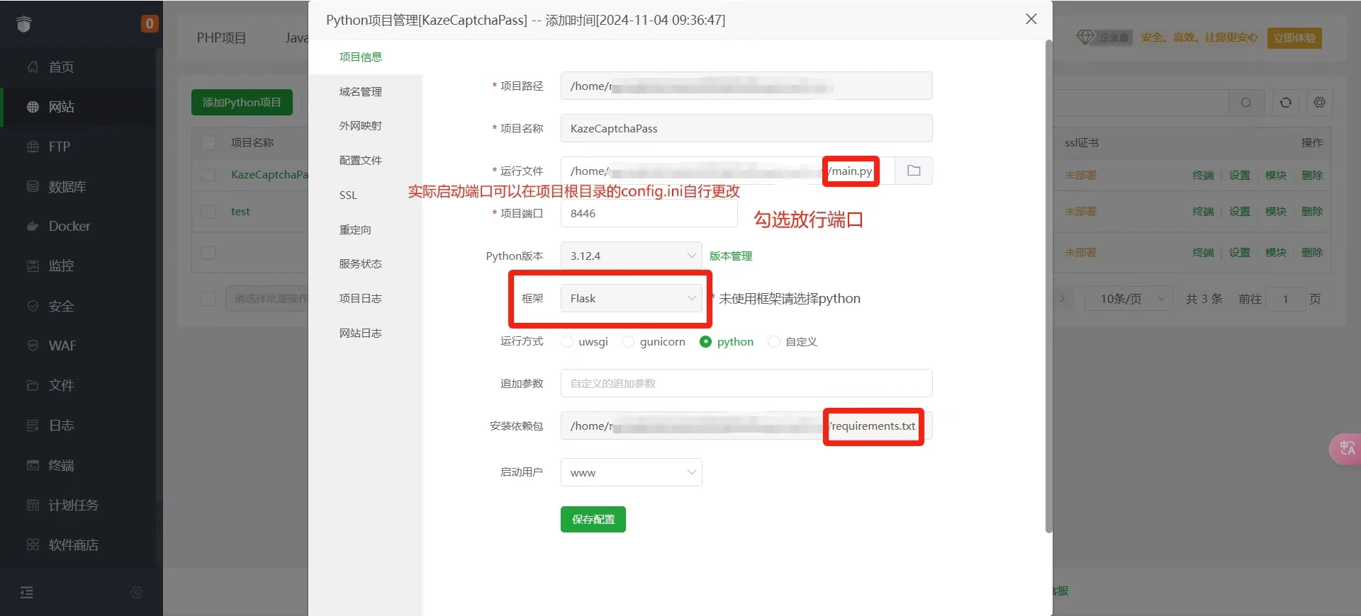 将源码压缩包保存到服务器后,用某面板几步就操作部署好了。但由于opencv-python包和ddddocr包的依赖较大,网速不好的安装可能需要十分钟左右,这个速度就看你服务器的带宽和地理位置在哪了。