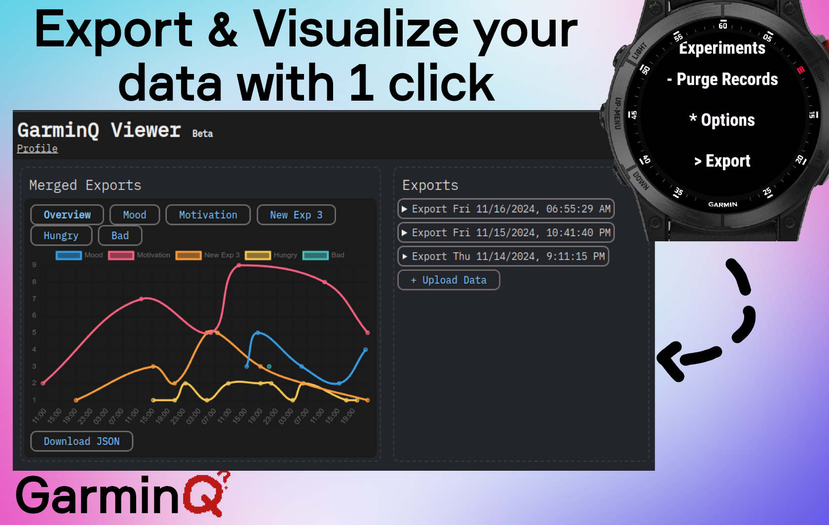 By recording your responses in real-time, GarminQ can provide invaluable insights into your behavioral patterns, mood fluctuation and daily habits/experiences.