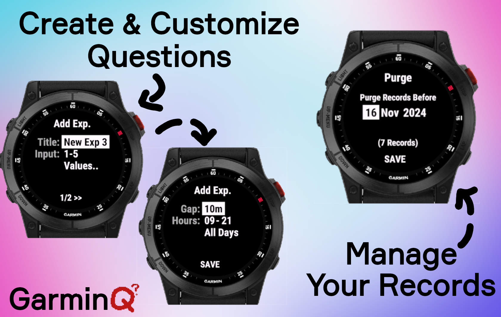 GarminQ is a Daily Diary / [Experience sampling Method](https://en.wikipedia.org/wiki/Experience_sampling_method) app for Garmin watches, which lets you create simple questions (experiments) which periodically triggers throughout the day or over longer periods of time and logs your responses.