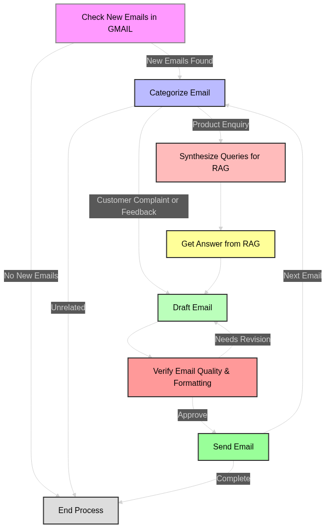 **Customer Support Email Automation** is an AI solution designed to enhance customer communication for businesses. Leveraging a Langgraph-driven workflow, multiple AI agents collaborate to efficiently manage, categorize, and respond to customer emails. The system also implements RAG (Retrieval-Augmented Generation) technology to deliver accurate responses to any business or product-related questions.