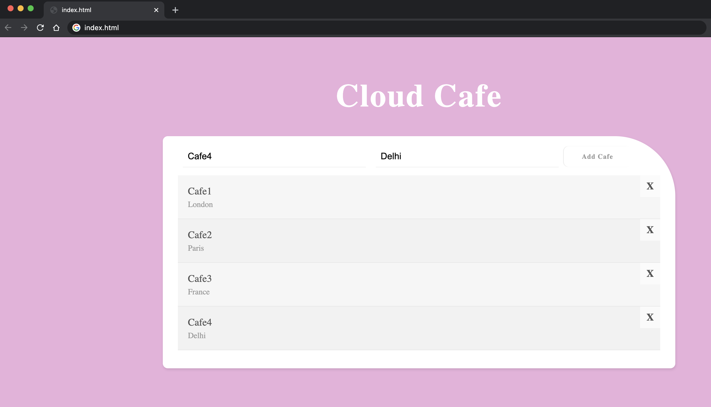 3. Delete any Cafe from the webpage and update the list.