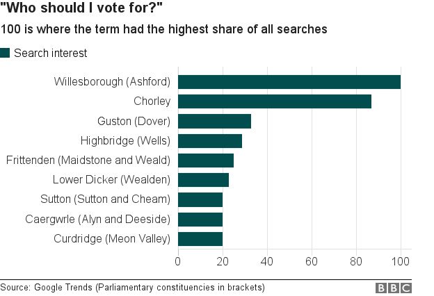 * CSV: ["Search interest in 'who should I vote for' by UK location over the last 7 days. All values indexed to 100, where 100 is the max value](https://raw.githubusercontent.com/BBC-Data-Unit/election-google/master/BBC-%20Google%20Trends%20request%20-%20who%20should%20I%20vote%20for.csv)