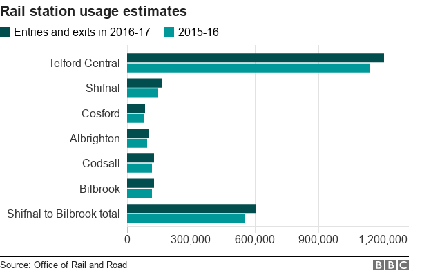 Analysis of [data from the Office of Rail and Road](http://orr.gov.uk/statistics/published-stats/station-usage-estimates) showed that passenger numbers at the five stations between Telford Central and Wolverhampton accounted for 602,952 entries and exits during 2016-17, around half as many as at Telford Central, which has a staffed ticket office and has more services calling at it (one of two hourly services to Telford misses out the other stations).