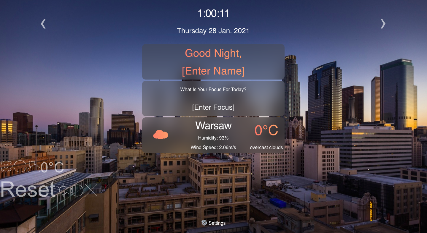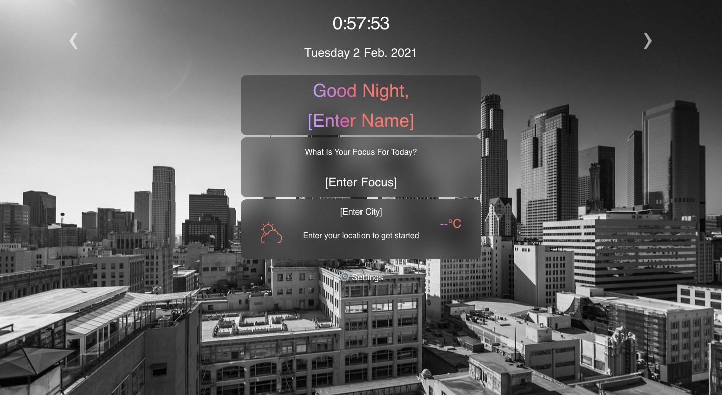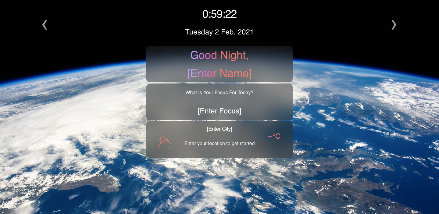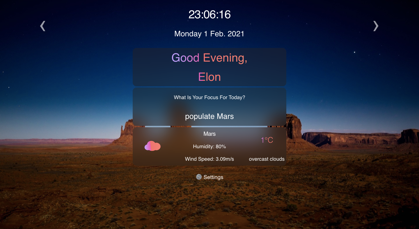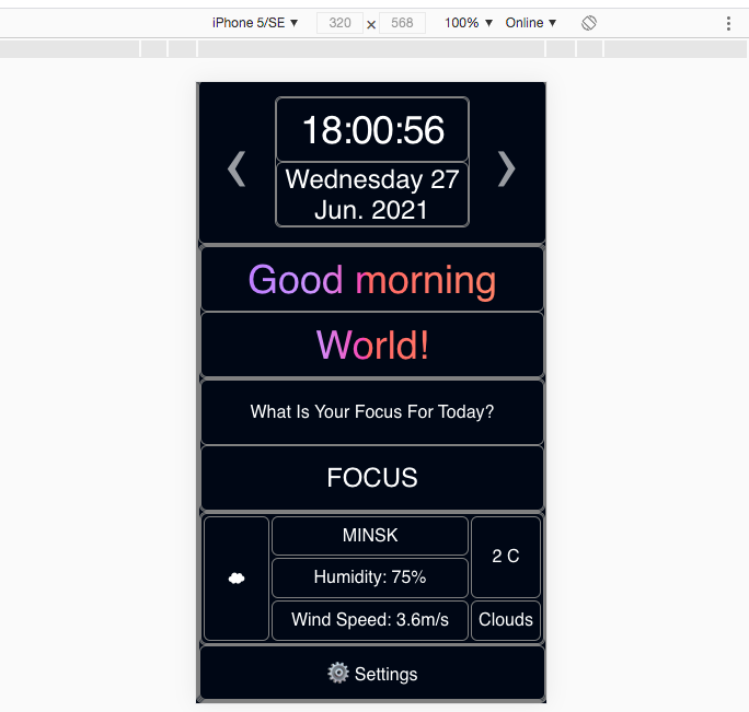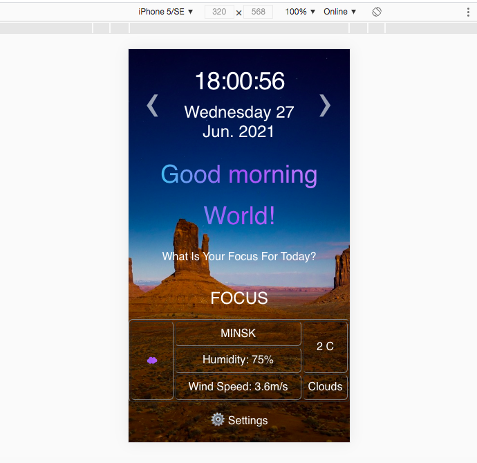 Momentum - is an analogue of the app of the same name in the Chrome web store. The application shows the time and username, his goal for the current day. The background image changes depending on the time of day. App uses local storage to store data..