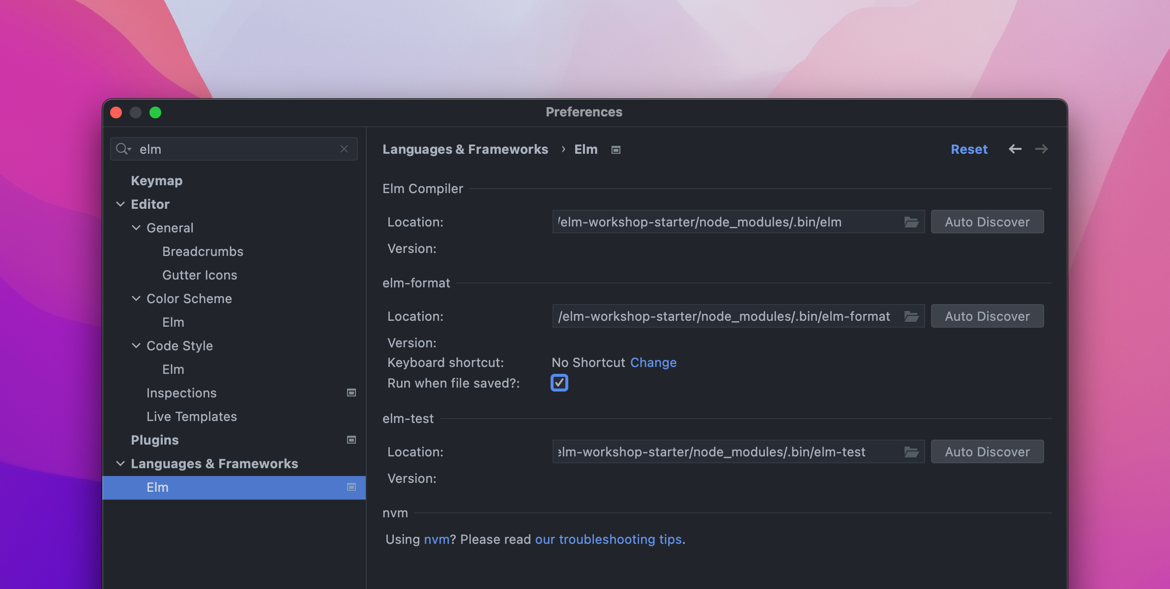 Dans "Language & Frameworks" cliquer sur "Elm" et cocher "Run when file saved?" :