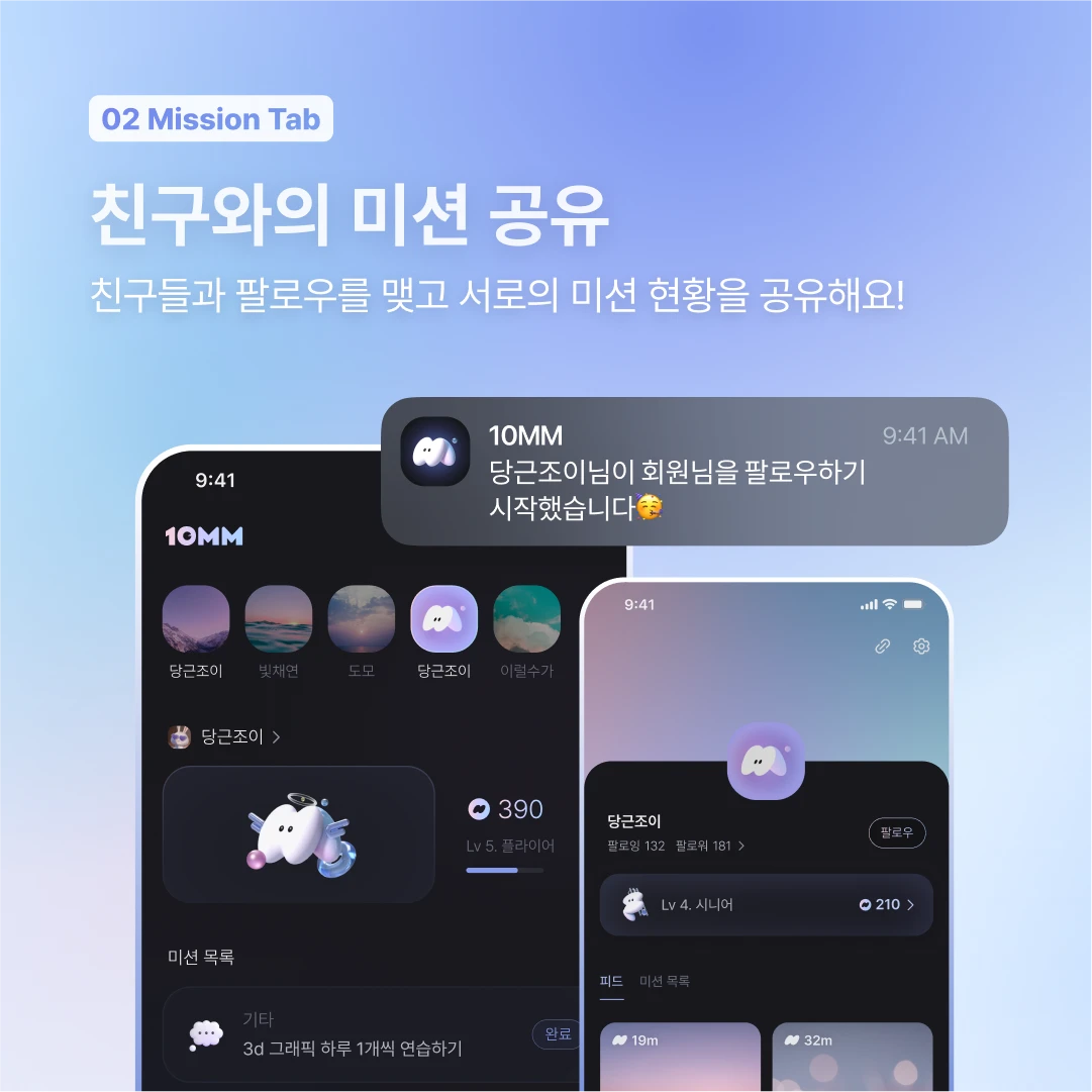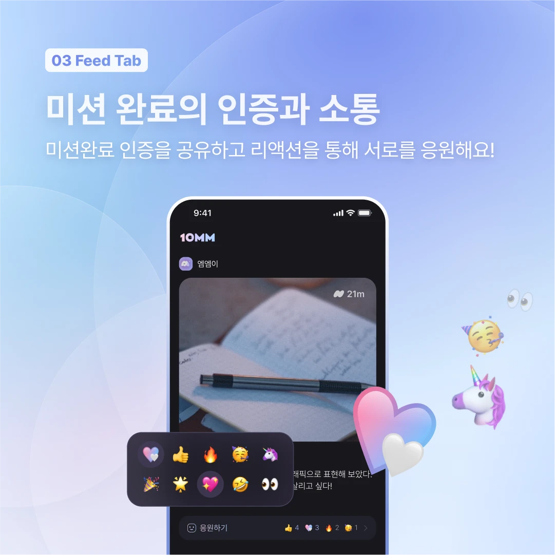 10MM은 그런 우리들의 자기 발전을 위해서 다양한 서비스를 제공합니다!목표설정 🎯 > 트래킹과 아카이빙 📊 > 인증과 공유 📸 과정을 통해 자연스러운 습관 형성 환경을 만들어 갈 수 있어요.