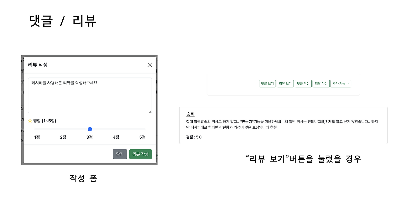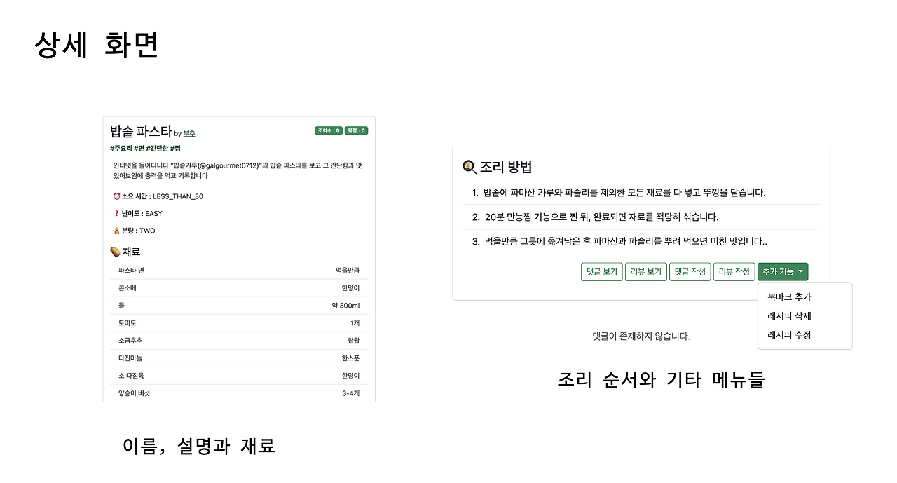 리뷰와 댓글을 통해 소통할 수 있는 레시피 공유 사이트입니다. 기본적인 소셜 인증, 컨텐츠에 대한 CRUD,
