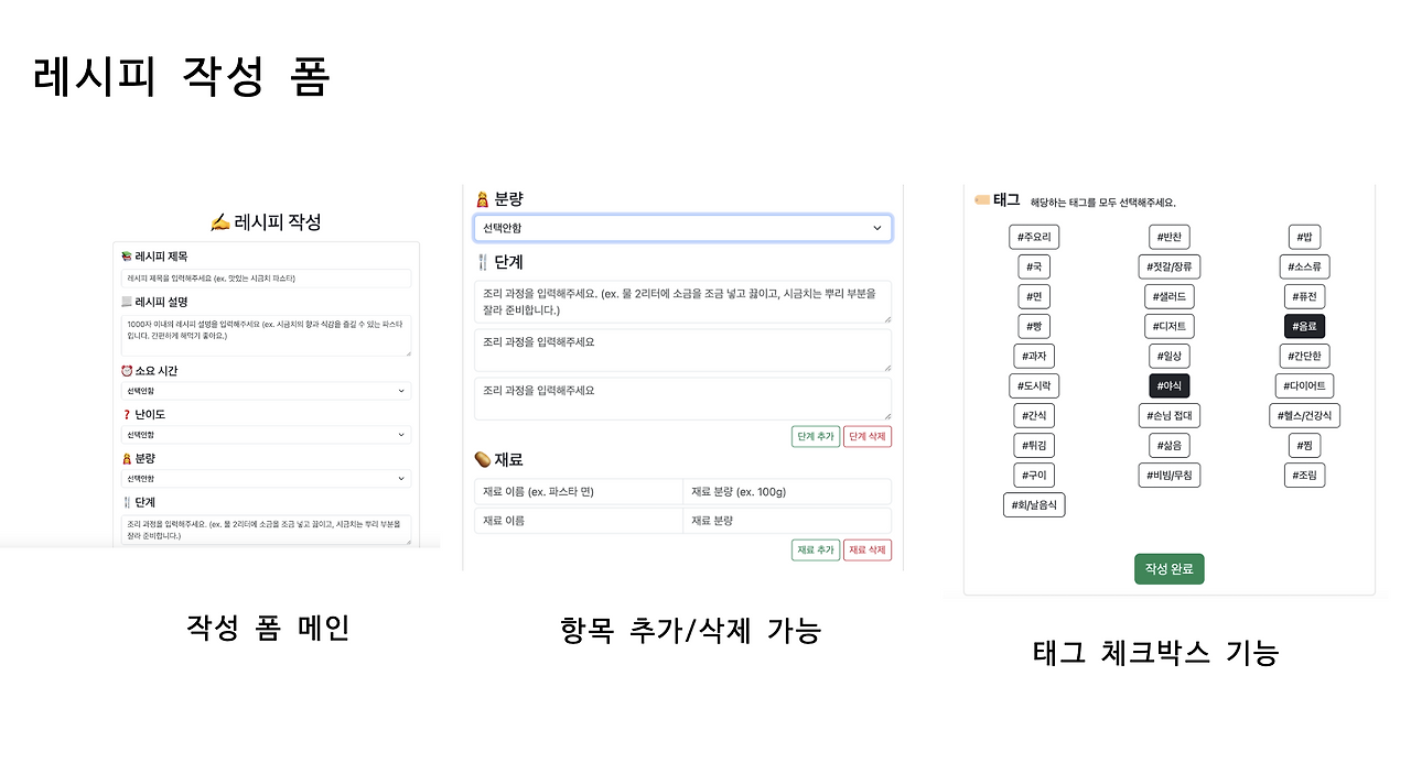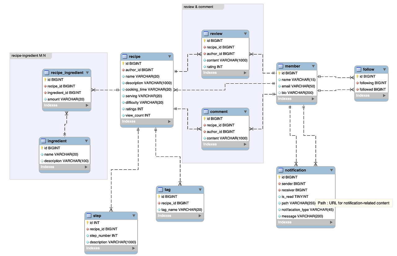 - 레시피와 연관 관계를 맺는 재료(M:N), 태그(1:N), 단계(1:N), 리뷰와 댓글(1:N)