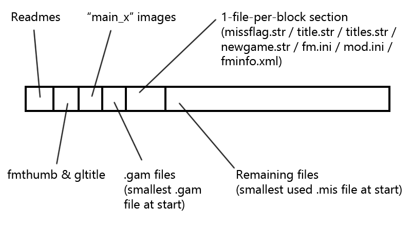 To maintain good compression ratios, .mis files (which are among the largest files in an FM) are packed in the "remaining files" block. However, the smallest used .mis file is placed at the start of the block for fast access. For Thief 1 and 2, a "used" .mis file means one that is specified in missflag.str and not marked "skip". For System Shock 2, all .mis files are considered "used". For Thief 3, no mission files need to be read to detect the game type, so this logic doesn't apply.