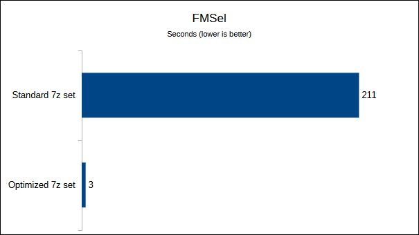 To show just how fast it is, I took a set of 1309 FMs and repacked them into .7z format in two different ways.