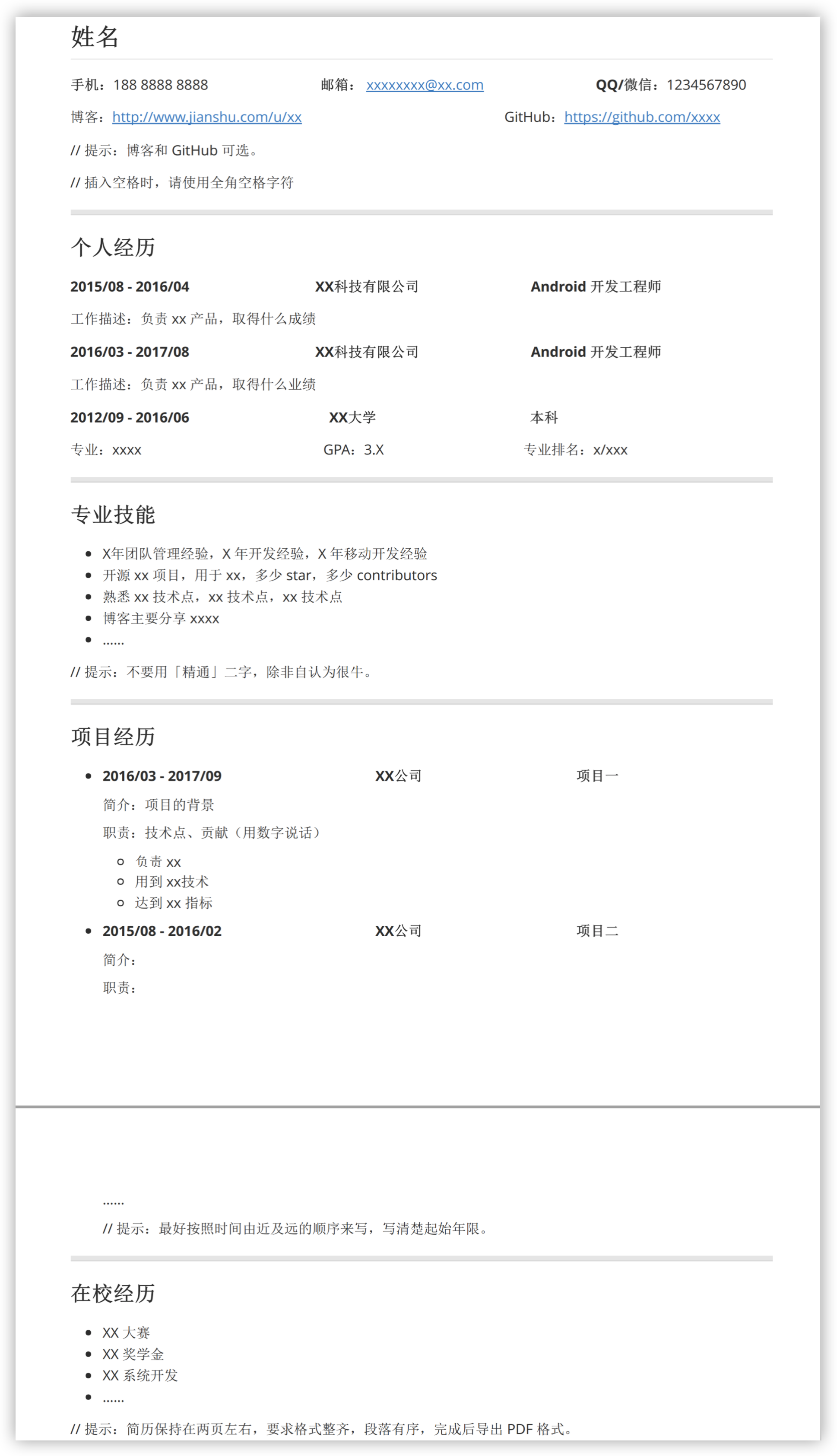 > 感谢 [Trinea](https://github.com/Trinea) 的模板——[推荐两个技术简历模板](http://b.codekk.com/detail/Trinea/%E6%8E%A8%E8%8D%90%E4%B8%A4%E4%B8%AA%E6%8A%80%E6%9C%AF%E7%AE%80%E5%8E%86%E6%A8%A1%E6%9D%BF)