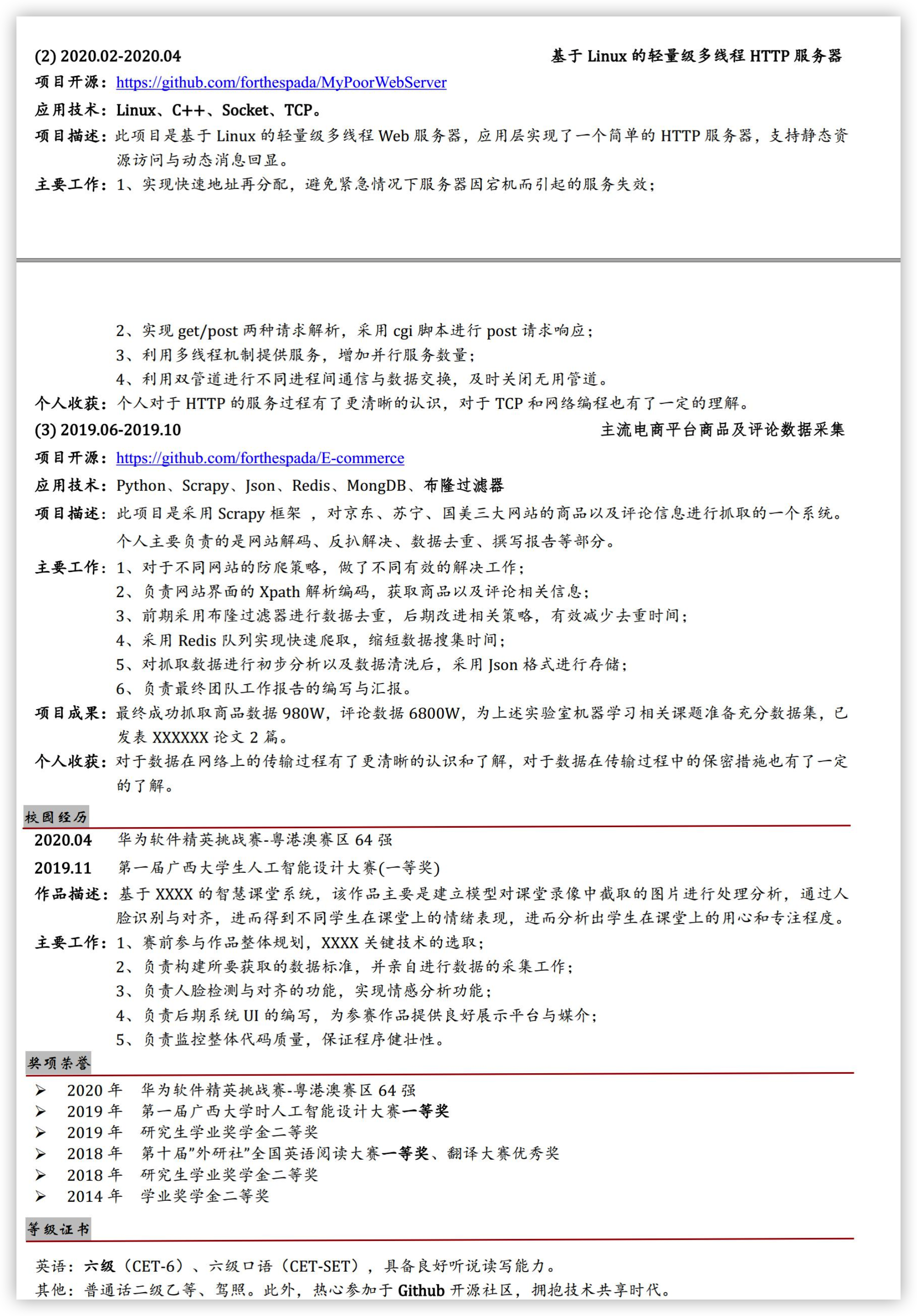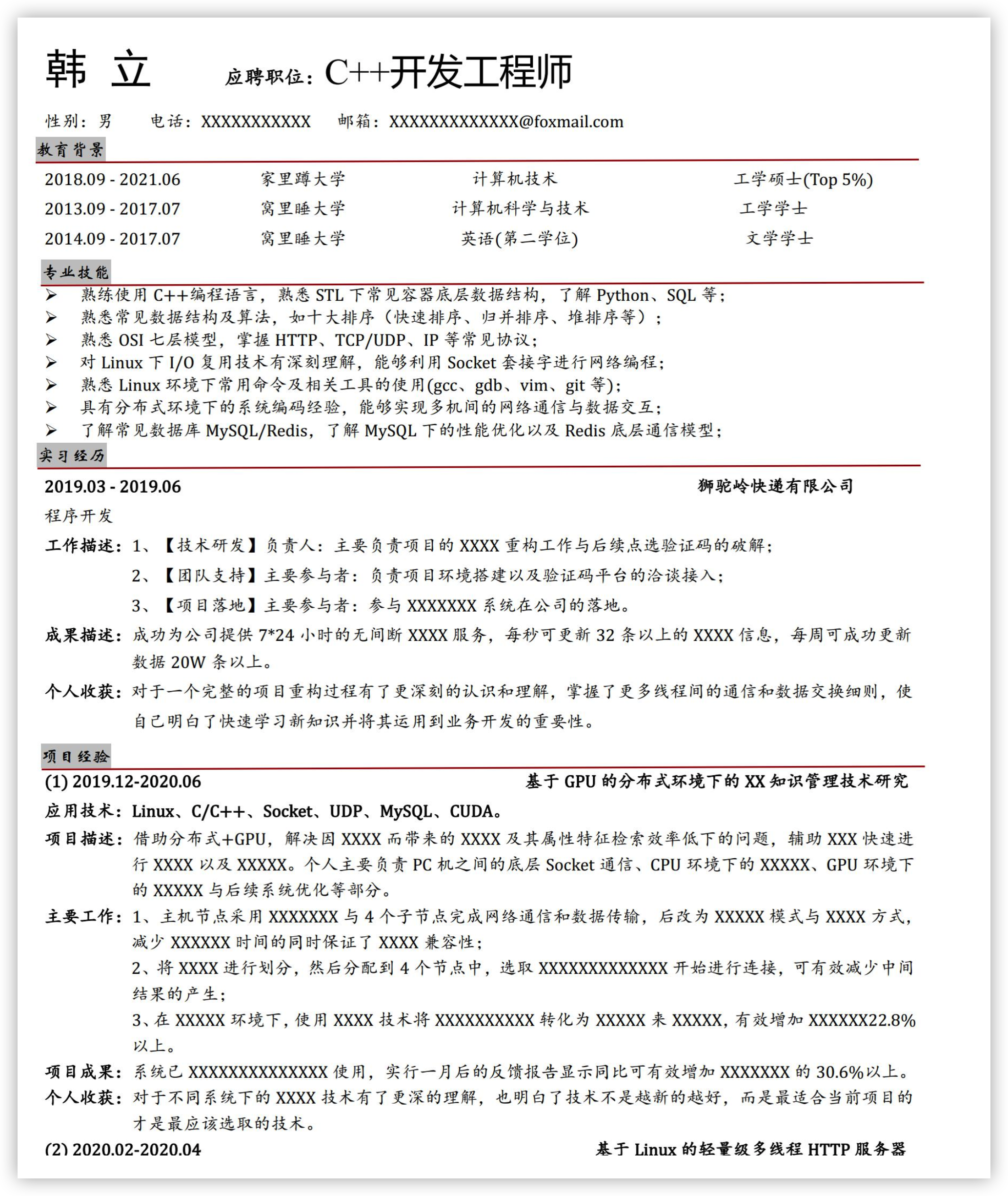 程序员简历,看完1000多份简历后,终于明白一份合格的计算机专业程序员简历应该是怎样的了,不需要花里胡哨,简简单单大大方方就足够了,可以star + folk后修改为自己的。