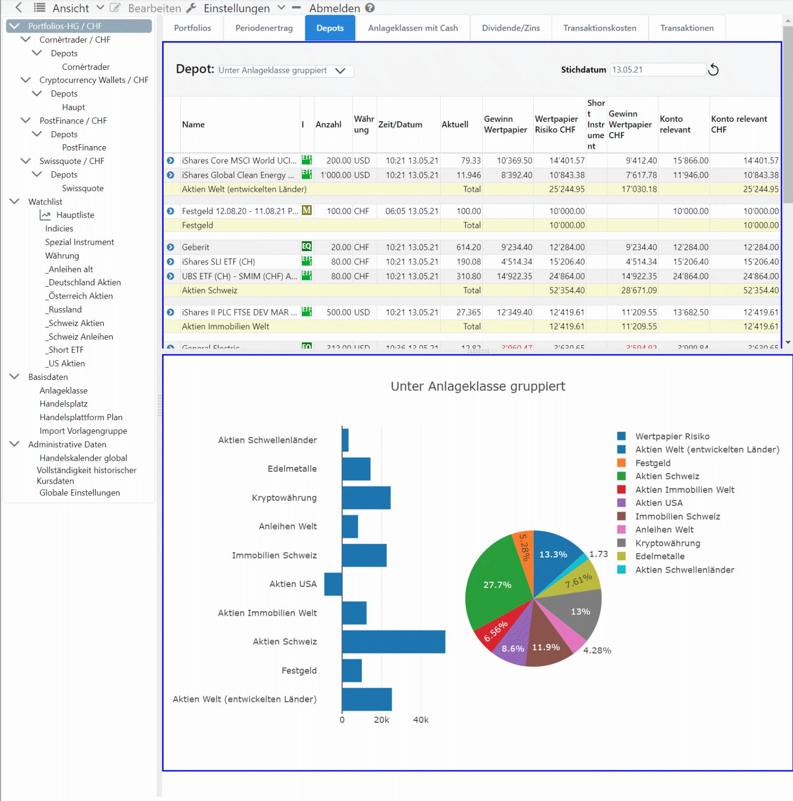 + **Import of transactions**: An import of single or multiple PDFs with securities transactions Via CSV file, account transactions can also be loaded.