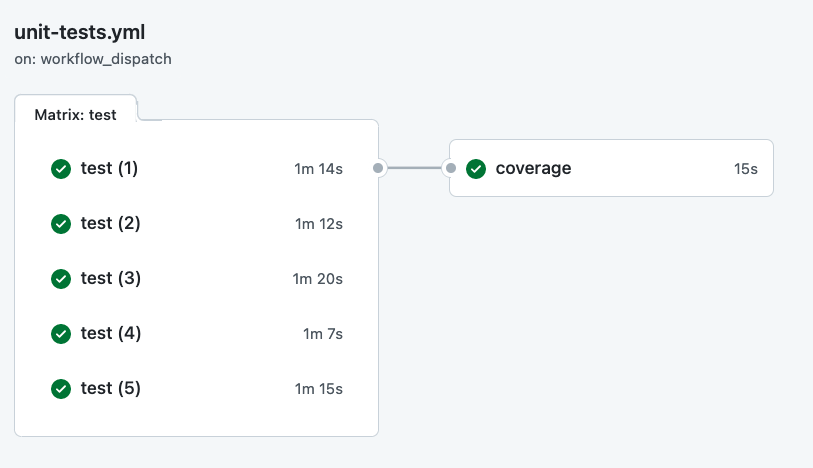 Executing the tests sequentially, the total execution time is around 5 minutes (6 * 10 seconds + 4 * 60 seconds). By using parallel execution via matrix strategy and pytest-split splitting feature, we can get significant boost to total execution time of CI.