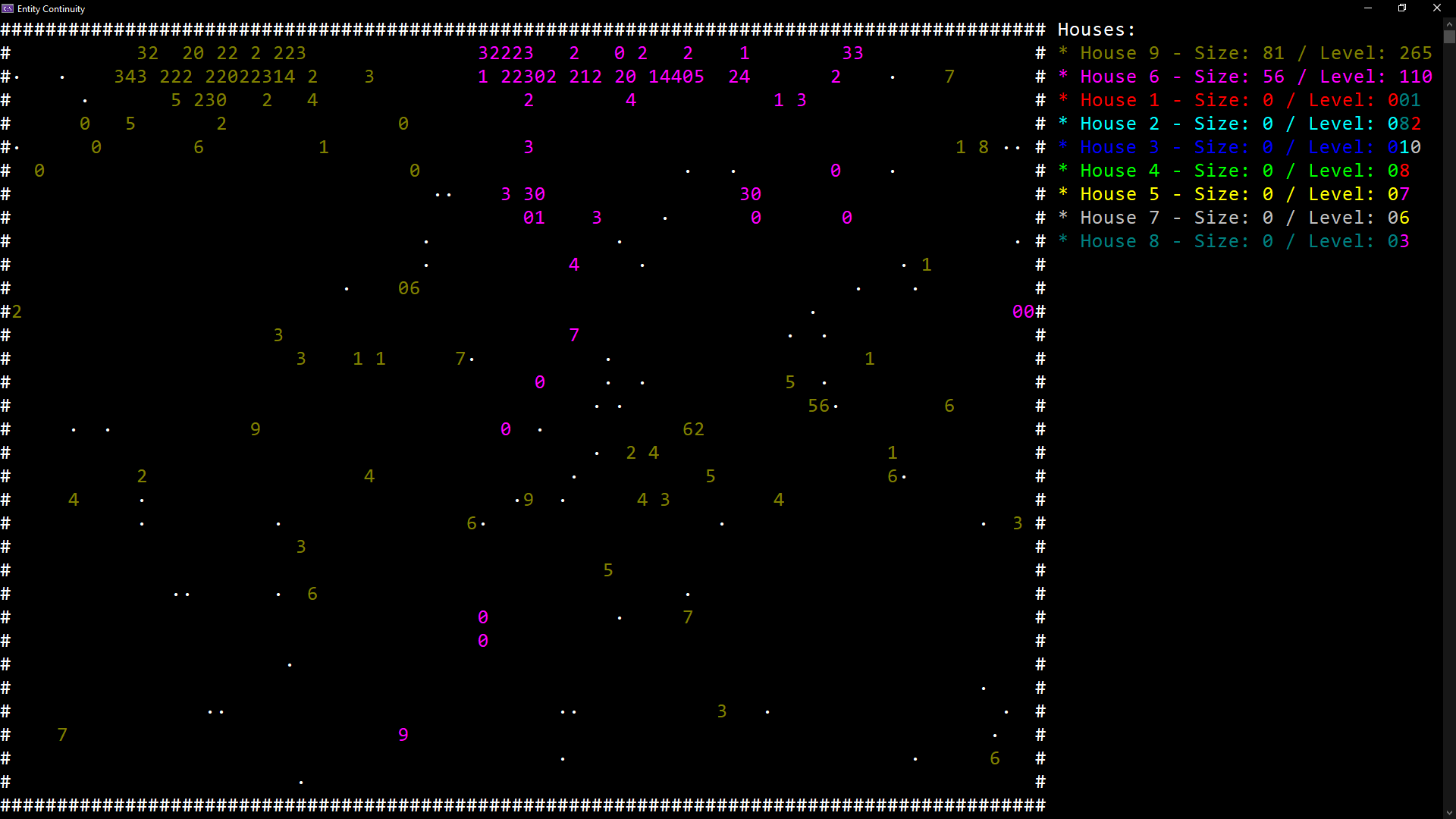 * As entities move around the map, they will increase their hunger level. The larger the cell's level, the faster this will happen. If a cell reaches 20, it will consume 1 of its levels until there are none left causing it to die.