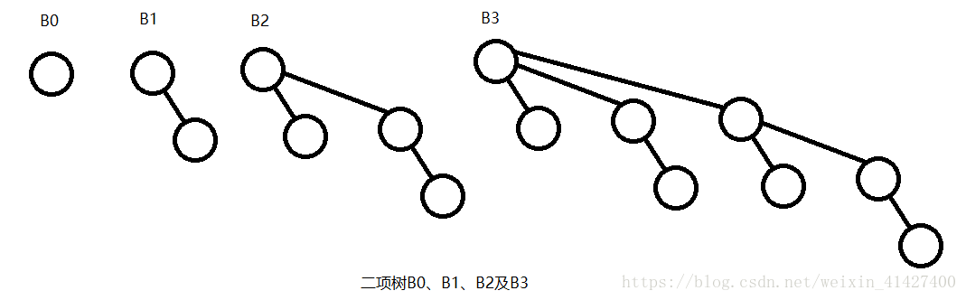 2. 高度为n的二项树`Bn`,通过将一颗二项树`B(n-1)`接到另一颗二项树`B(n-1)`上构成;
