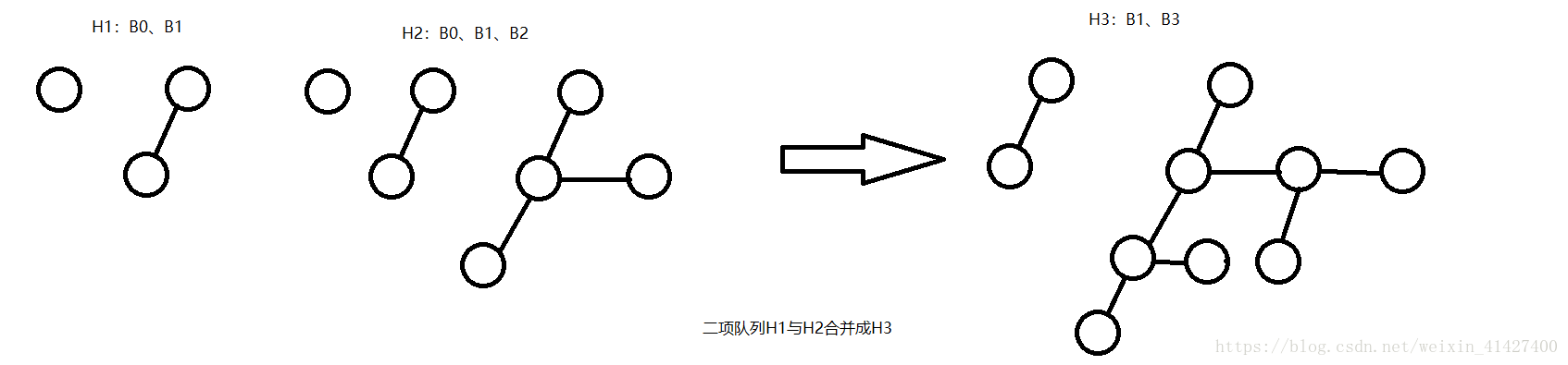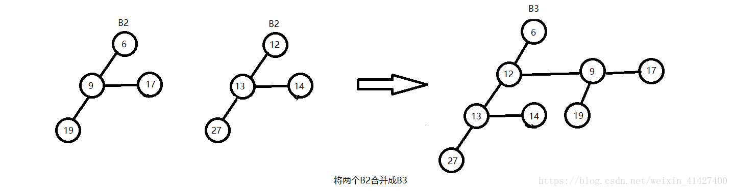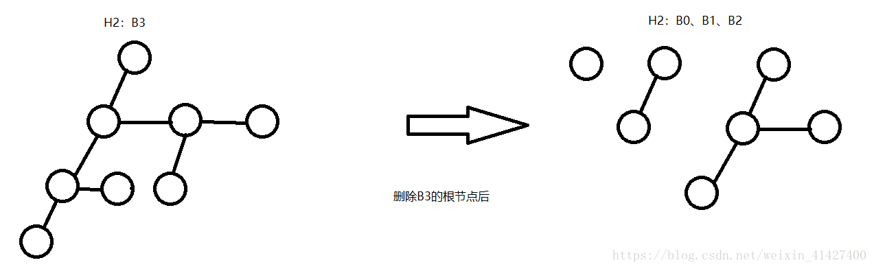 2. 在H2中删除最小的节点后,将二项树的每一个儿子作为新的二项树的树根;(如下图所示)