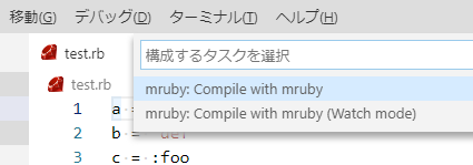 1. `mruby: Compile with mruby`または`mruby: Compile with mruby (Watch mode)`を選択してください。\