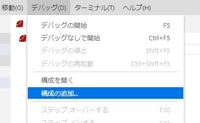 1. メニューから `デバッグ` → `構成の追加...` を選択してください。\