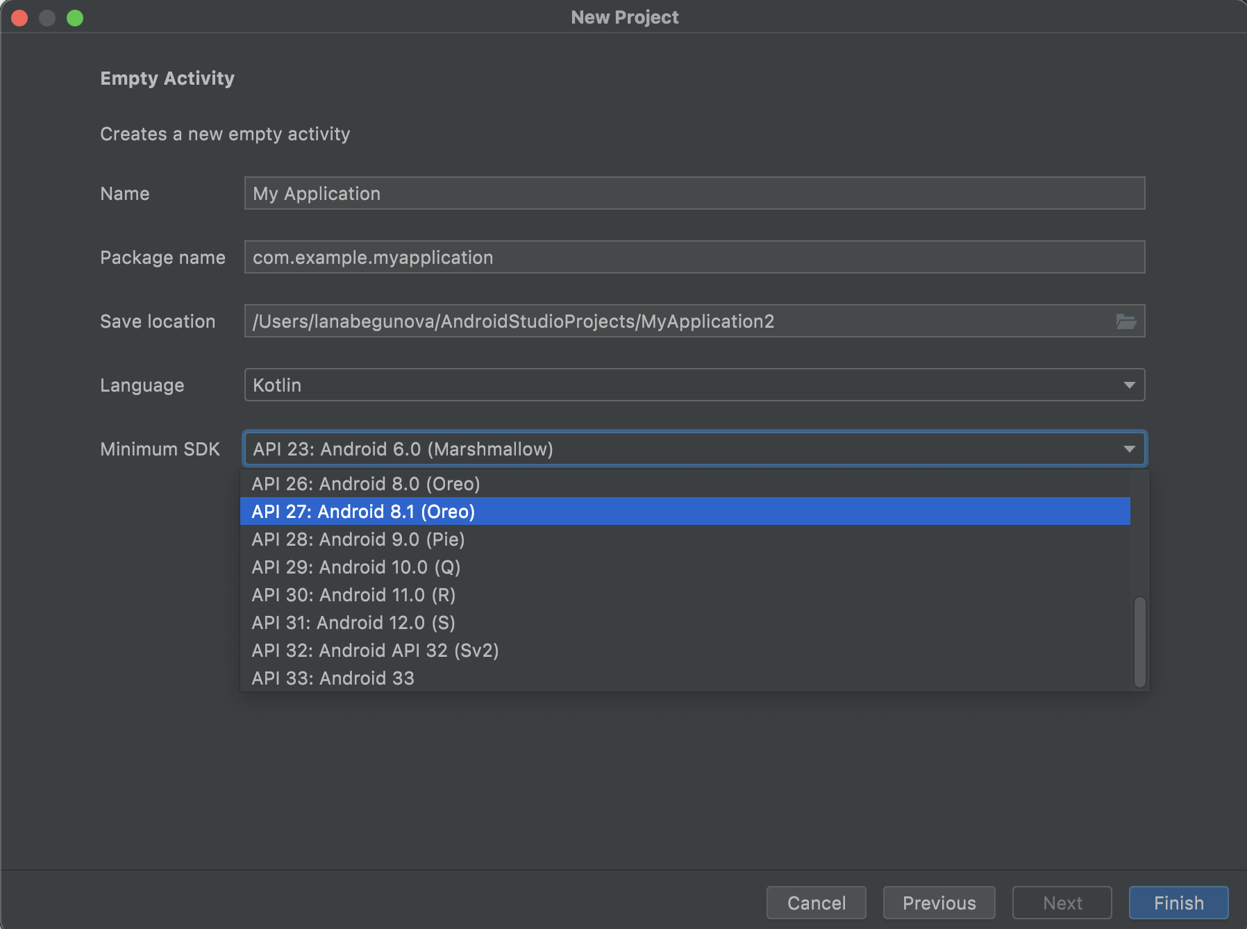The Minimum SDK version ([API Level](https://www.youtube.com/watch?v=lmozs_yqLY8&list=PPSV&ab_channel=BandeKhoda)) determines the lowest level of Android that my app will run on. I typically want to target as many users as possible, so I'd ideally support everyone -- with a minSDK version 1. However, that has some disadvantages, such as lack of features, and very few people use such old devices. My choice of minSDK is a tradeoff between the distribution of users I want to target and the features that my app will need.