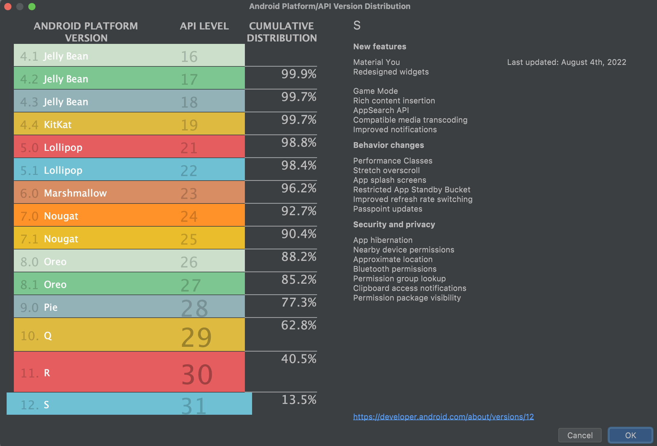 Click on each Android Version/API level for more information.
