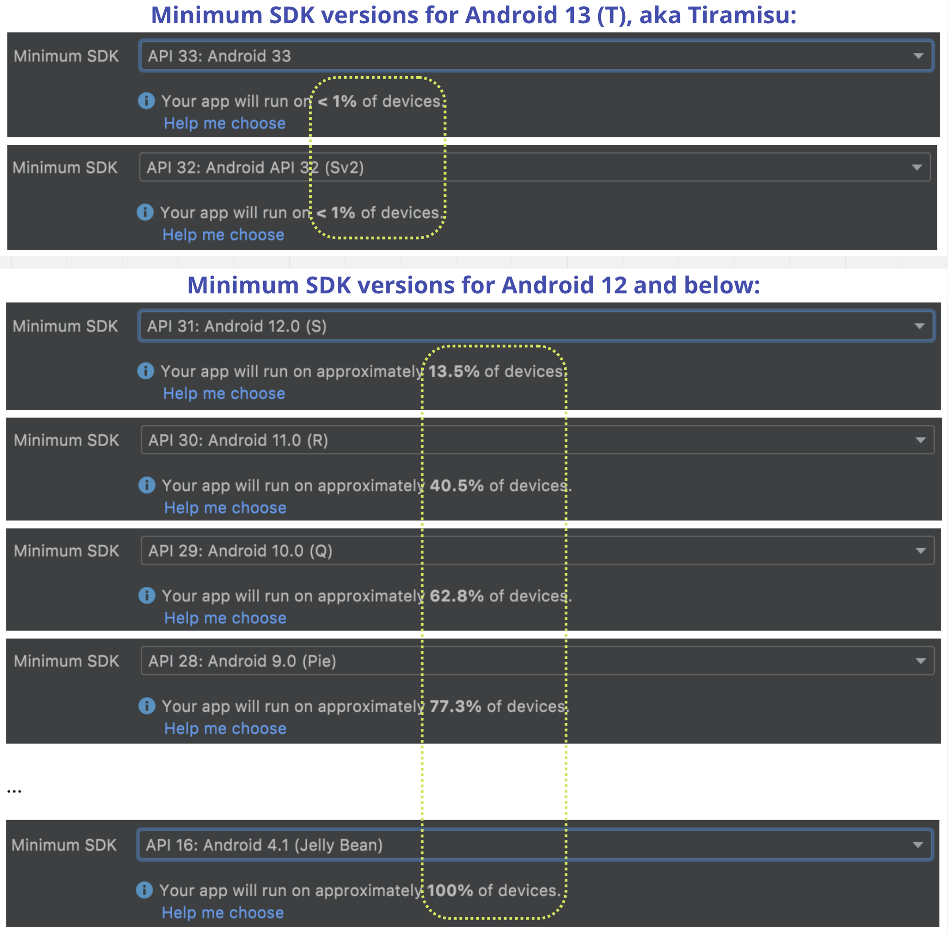 Click on __Help me choose__ under a particular minSDK version to display additional distribution-related info: