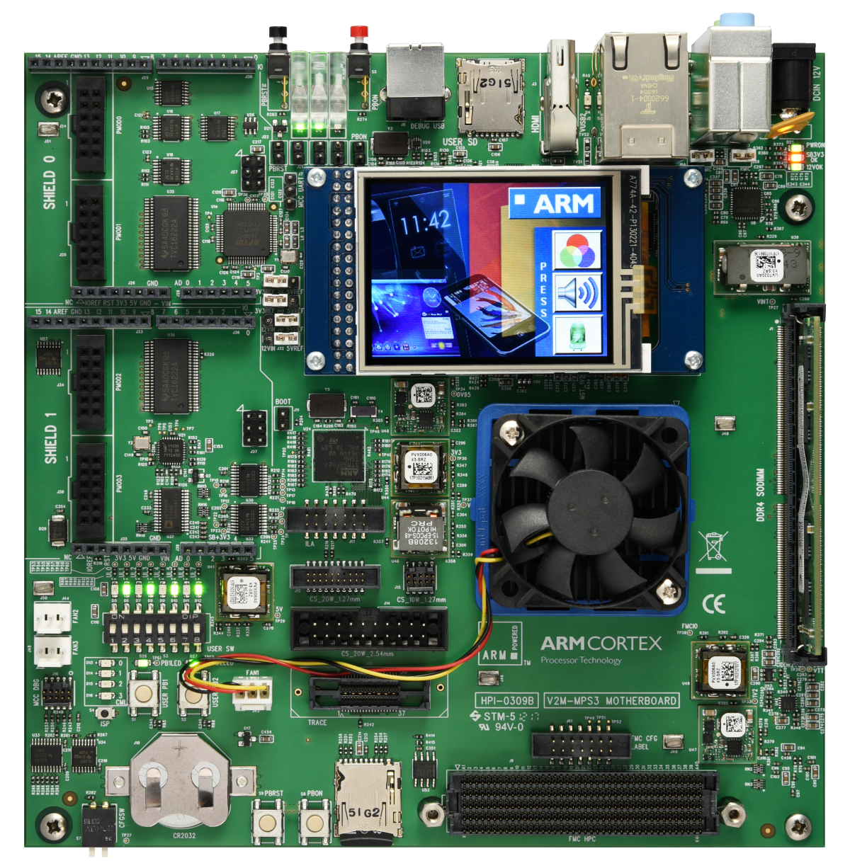 A LVGL porting for Cortex-M55 running on an [Arm official FPGA prototyping development board](https://developer.arm.com/tools-and-software/development-boards/fpga-prototyping-boards/mps3) called MPS3 ([AN547](https://developer.arm.com/tools-and-software/development-boards/fpga-prototyping-boards/download-fpga-images#)), see **Figure 1**. It is also possible to run the project template on an emulator called [Corstone-300-FVP](https://developer.arm.com/tools-and-software/open-source-software/arm-platforms-software/arm-ecosystem-fvps), which is free.**Figure 1 Arm MPS3 FPGA prototyping board**