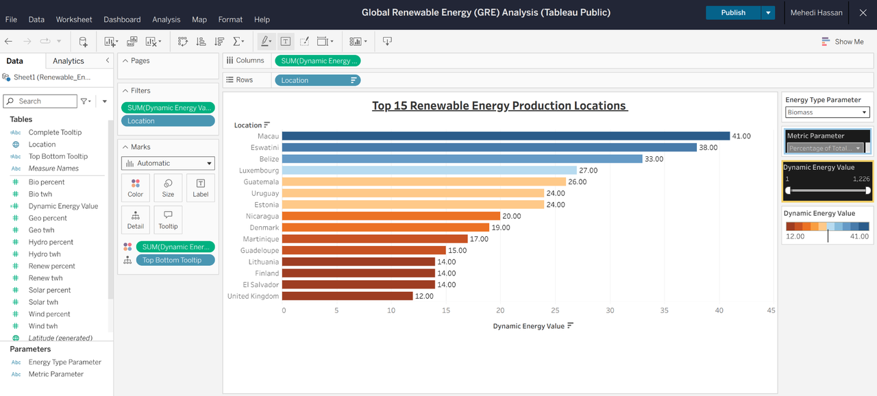 Data analysis project analysing renewable energy production across 212 countries, visualizing trends with Tableau. Highlights China's dominance (2,894 TWh) and Paraguay's 100% renewable share.