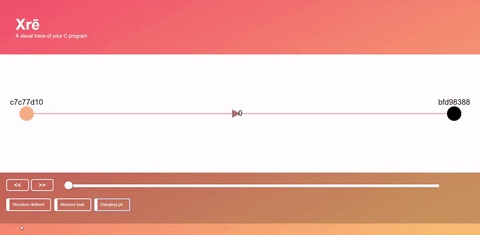 Xre allows you to implement any pointer-node based data-structures with minimum changes to the memory allocation portions of your code. Xre launches a local server which presents you with a visual representations of the nodes and data on your program's heap. This allows you to step through your program's visual trace, making it easy to spot dangling pointers, leaked memory and other pointer redirection errors.