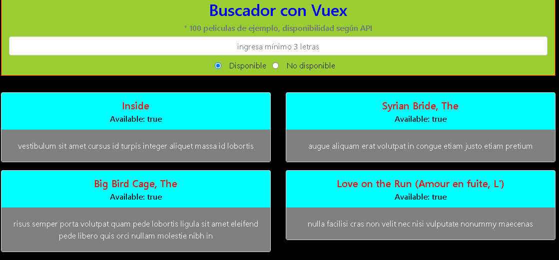 Ejemplo VUEX, uso de STATE, MUTATIONS y GETTERS (que hacen una copia del estado, sin modificarlo), estilos SASS, metodología BEM y uso de la web Mockaroo para descargar archivo .JSON