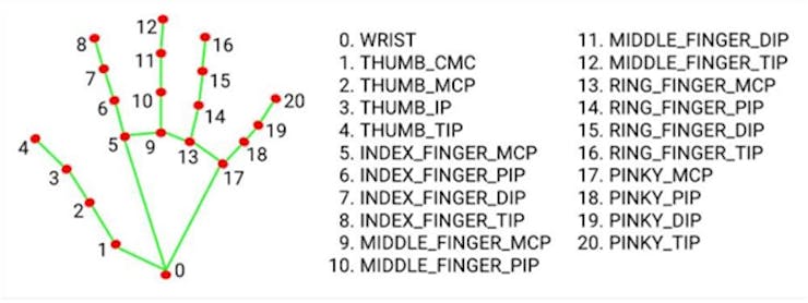 Mediapipe is an open-source machine learning library of Google, which has some solutions for face recognition and gesture recognition, and provides encapsulation of python, js and other languages. MediaPipe Hands is a high-fidelity hand and finger tracking solution. It uses machine learning (ML) to infer 21 key 3D hand information from just one frame. We can use it to extract the coordinates of the key points of the hand.
