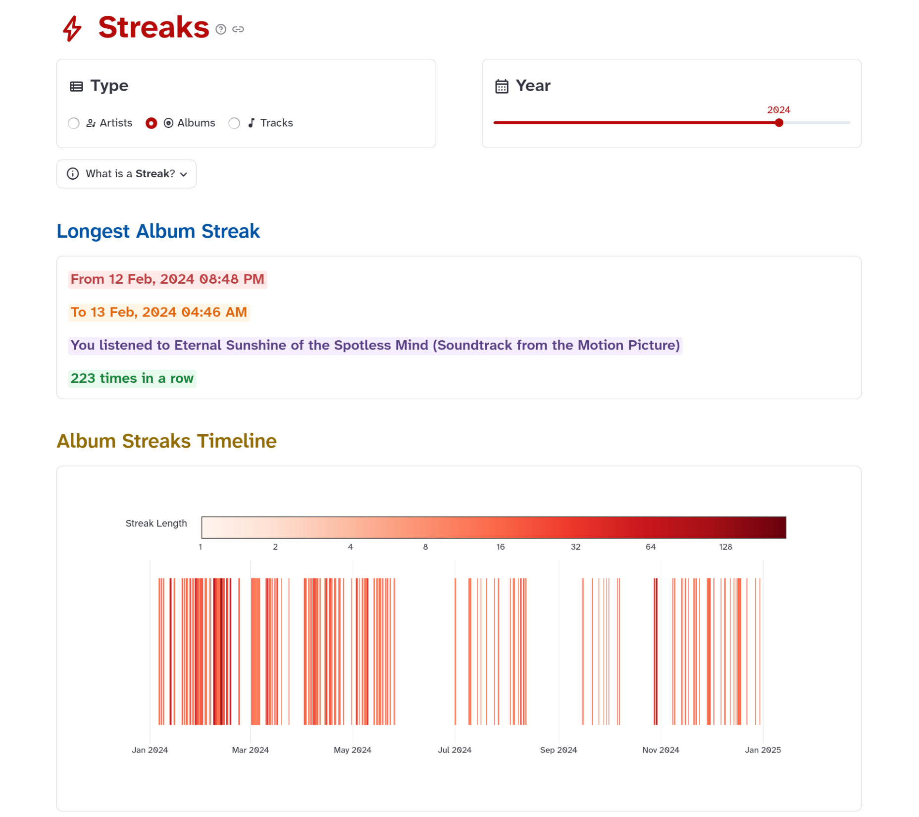 - Detect periods of intense, repeated listening to a single artist, album, or track. Streaks often correspond to emotionally significant moments or phases.