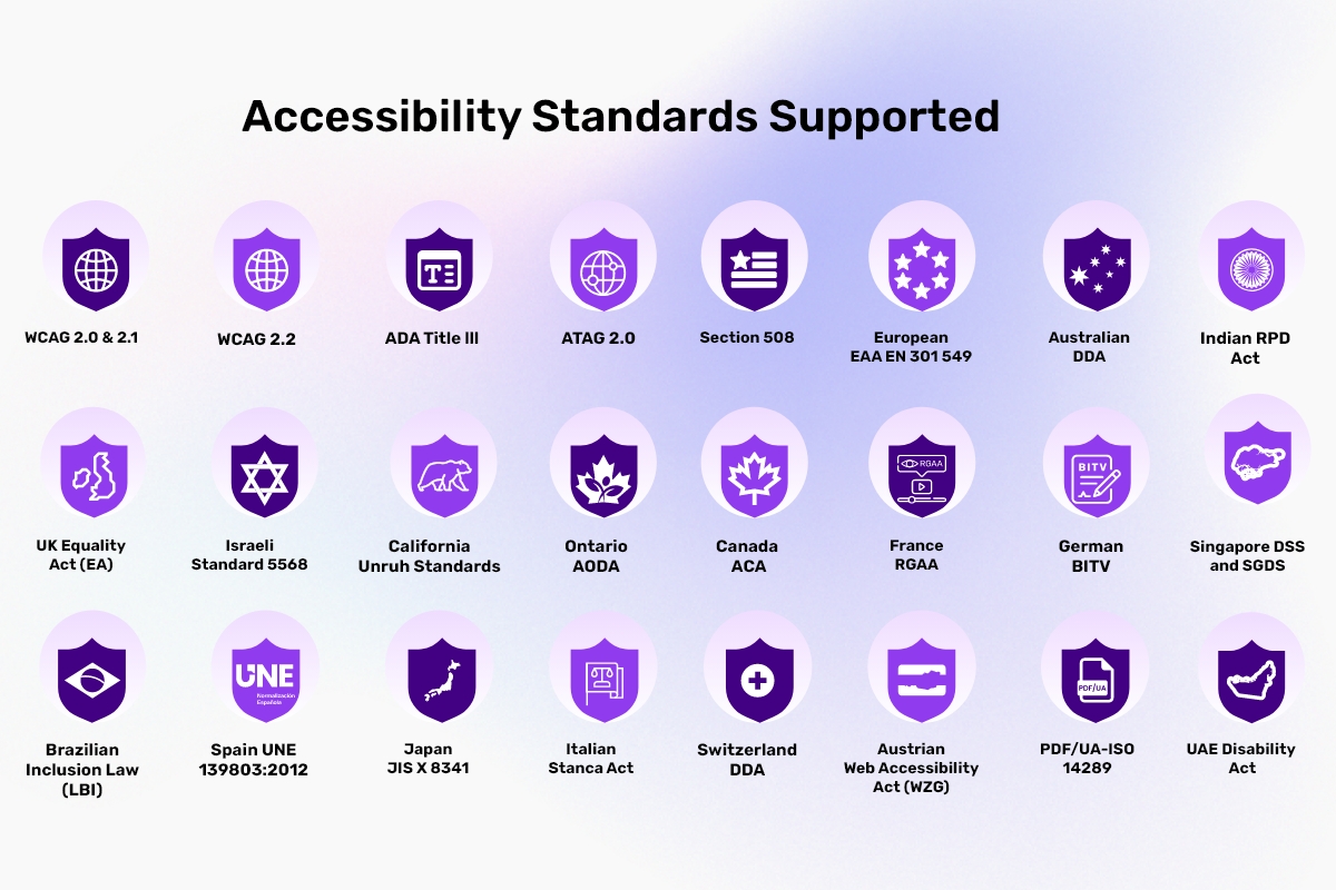It improves website ADA compliance and browser experience for ADA, WCAG 2.0, 2.1 & 2.2, Section 508, California Unruh Act, Australian DDA, European EAA EN 301 549, UK Equality Act (EA), Israeli Standard 5568, Ontario AODA, Canada ACA, German BITV, France RGAA, Brazilian Inclusion Law (LBI 13.146/2015), Spain UNE 139803:2012, JIS X 8341 (Japan), Italian Stanca Act and Switzerland DDA Standards.