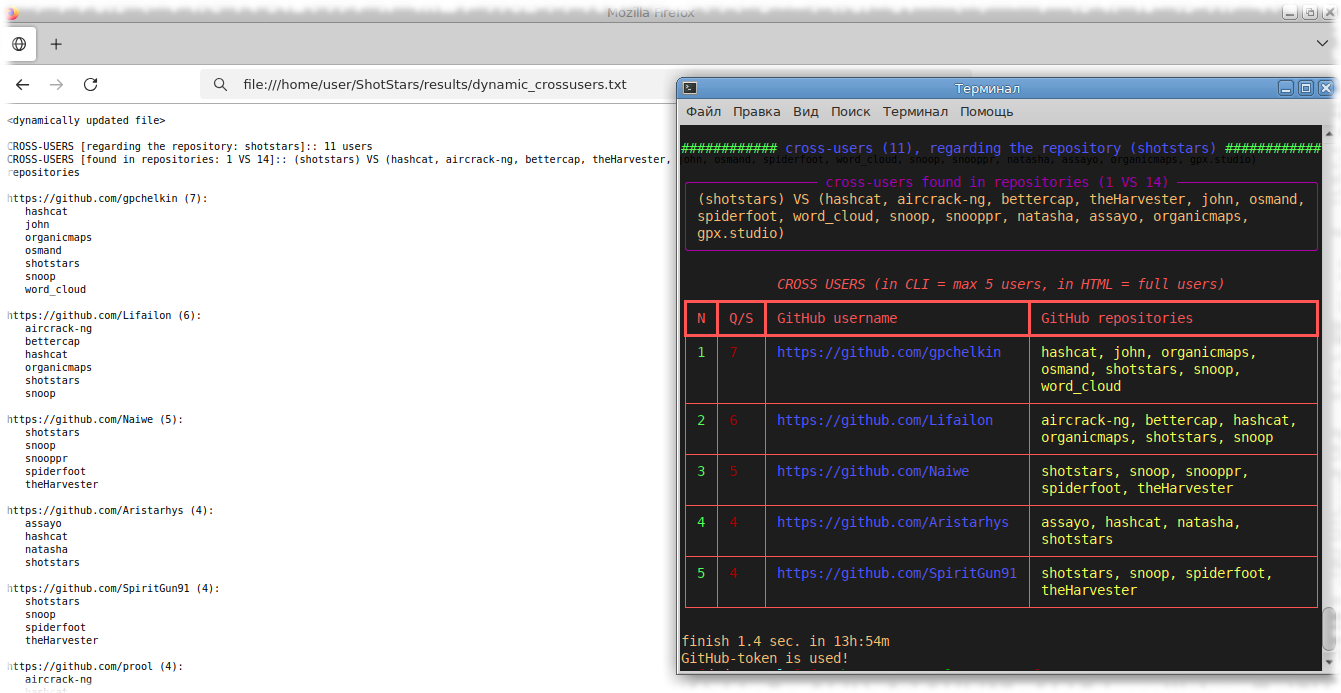 - [X] Shotstars находит пересекающихся у Github-проектов пользователей, в т.ч. и тех, у кого профиль скрыт/приватный.