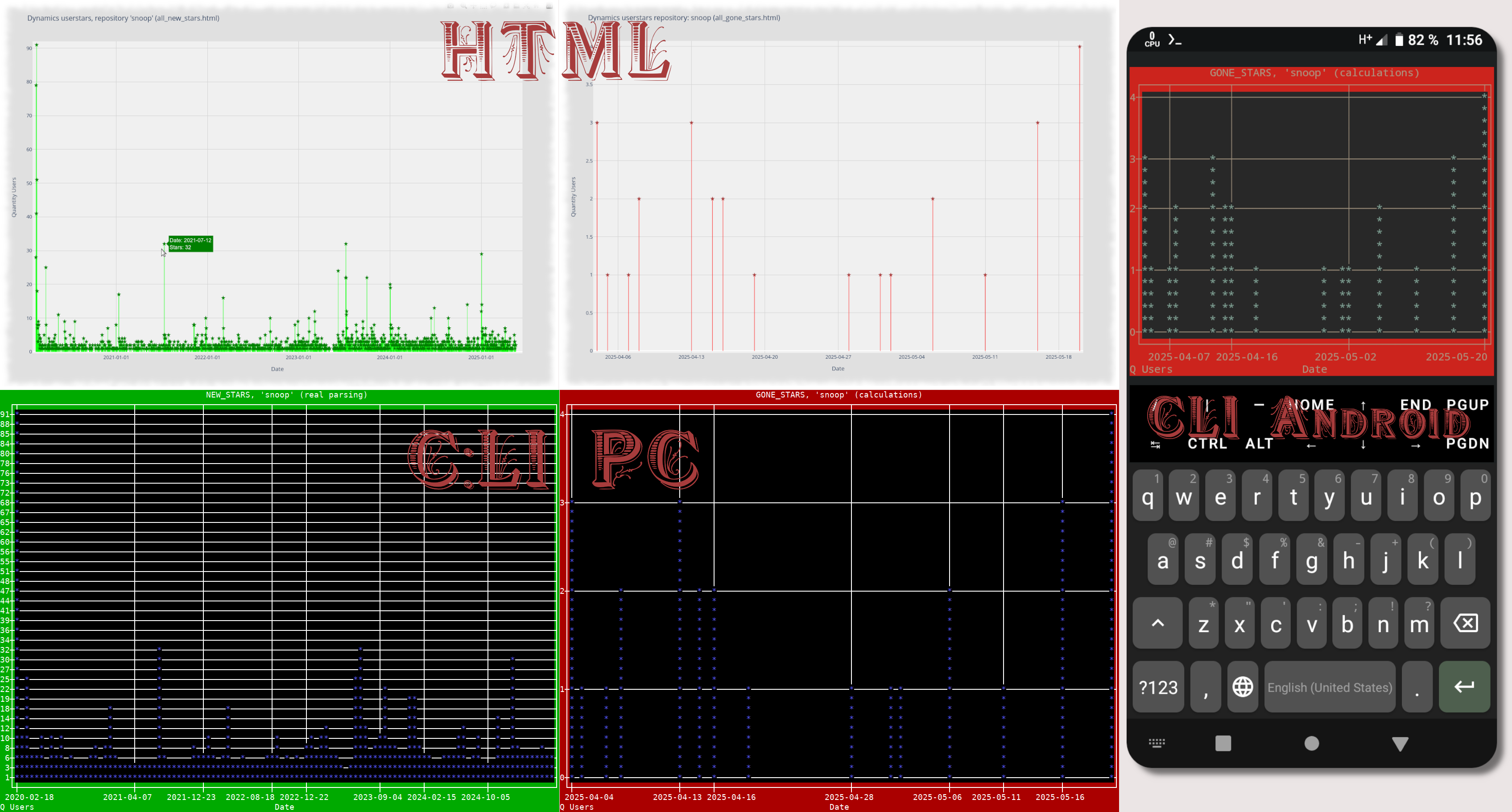 *8 Shotstars generates HTML-CLI timelines of a repository's star history, both new and gone.*