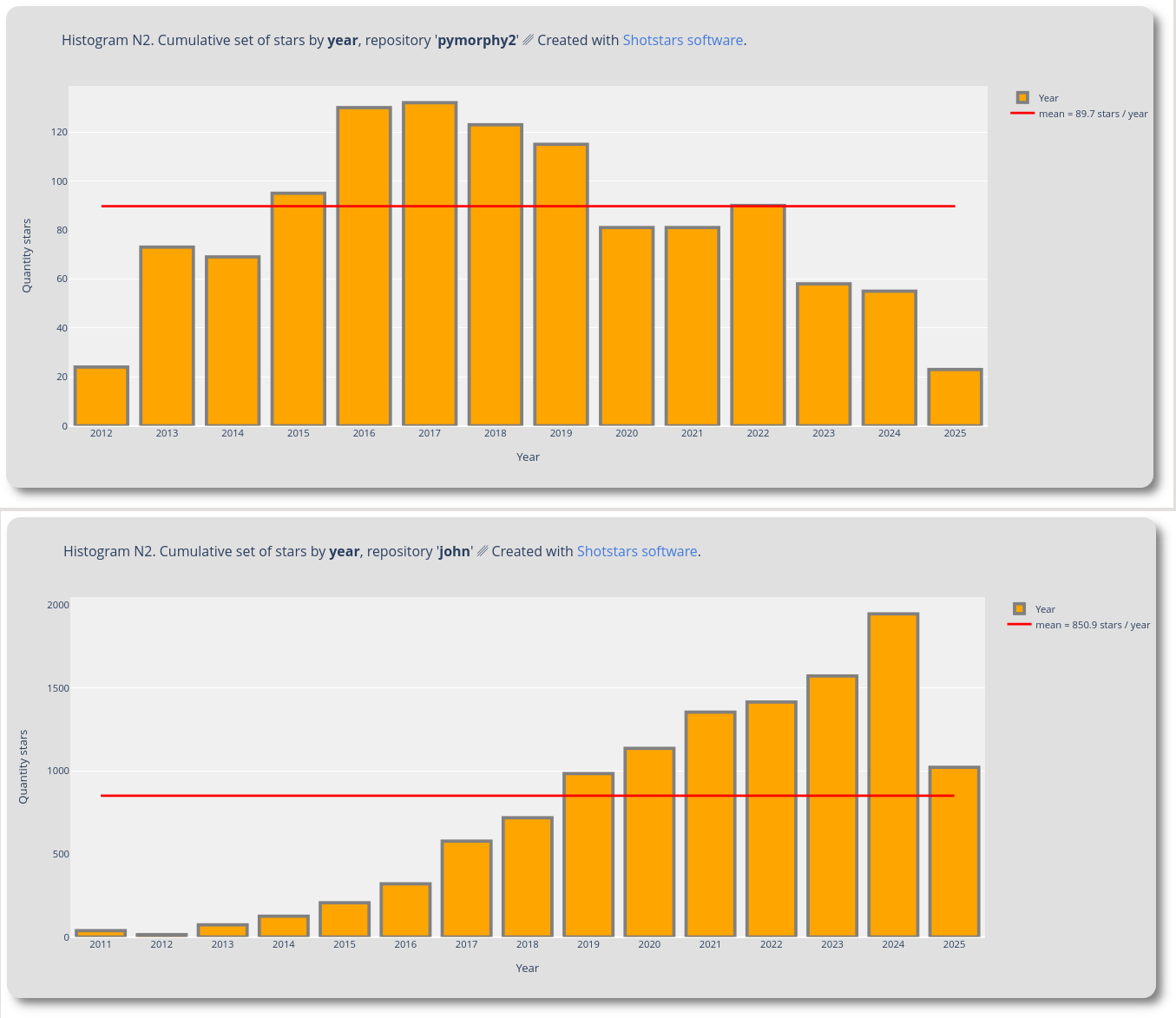 - [X] Shotstars создает графики и гистограммы с поддержкой [ночного режима](https://github.com/snooppr/shotstars/issues/11) *(вся история звезд по дате/времени: по месяцам, по годам, по часам, по дням недели, кумулятивный набор звезд)*.