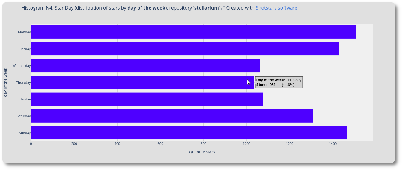 Starry day of week. From the graph it is clear that stars come intensively at the beginning and end of the working week for this repository. Oh, and outside the US, people start their workweek according to international norms — on Monday, not Sunday.