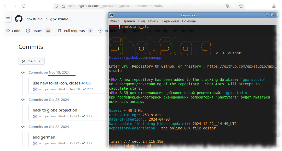 - [X] Shotstars сообщает реальную дату создания репозитория *(факт: разработчики могут заявлять/подделывать/изменять дату создания своих проектов и коммитов, но Shotstars им не обмануть, утилита отобразит реальные цифры)*.