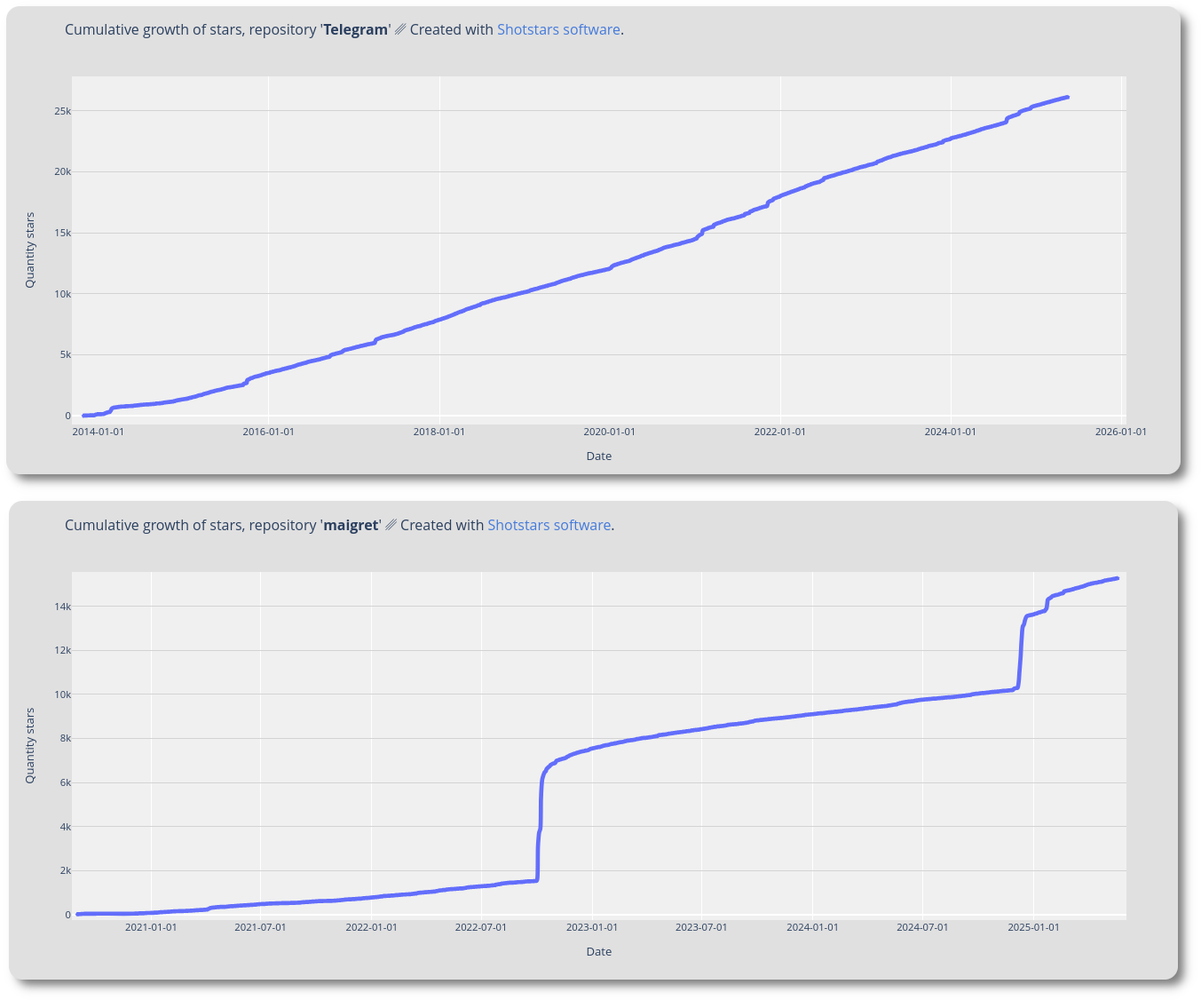 Comparison of two repositories, cumulative set of stars. The upper screenshot is the usual movement of stars, the lower screenshot is the promotion of fake stars.