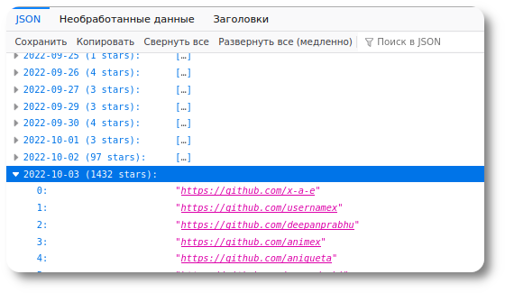 For example, can a network user say: how many stars have been added or subtracted from some interesting GitHub repository in a month? *(IT hosting does not provide information on the decrease in stars, even to the owner of its own projects)*.