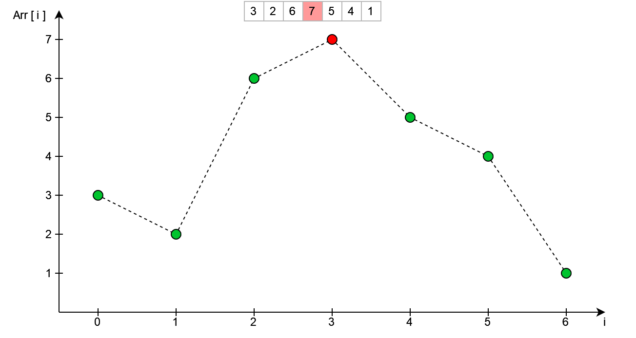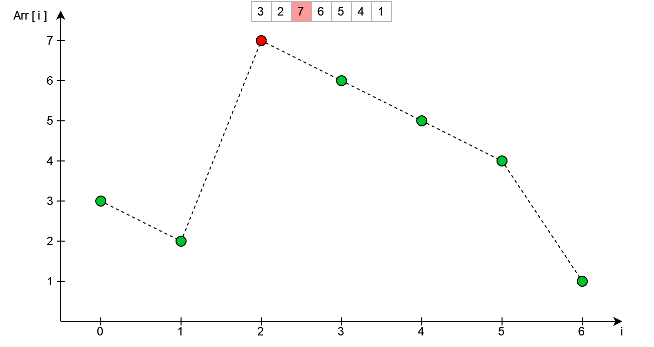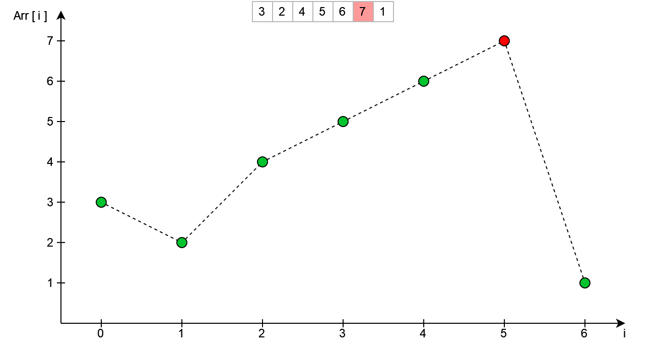Następnym krokiem jest znalezienie wierzchołka - patrząc z prawej strony. W kodzie wykonane zostanie to przez iterowanie się od końca tablicy do początku - sprawdzając przy tym czy aktualny element jest mniejszy od poprzedniego.