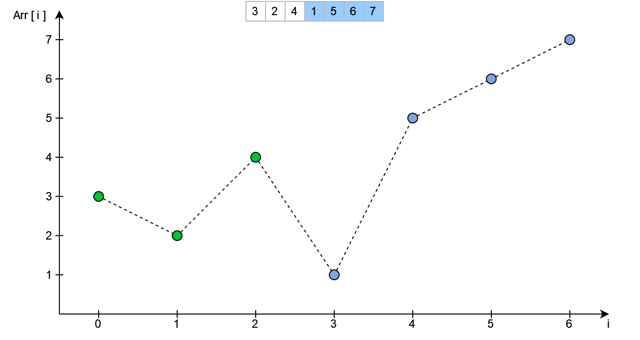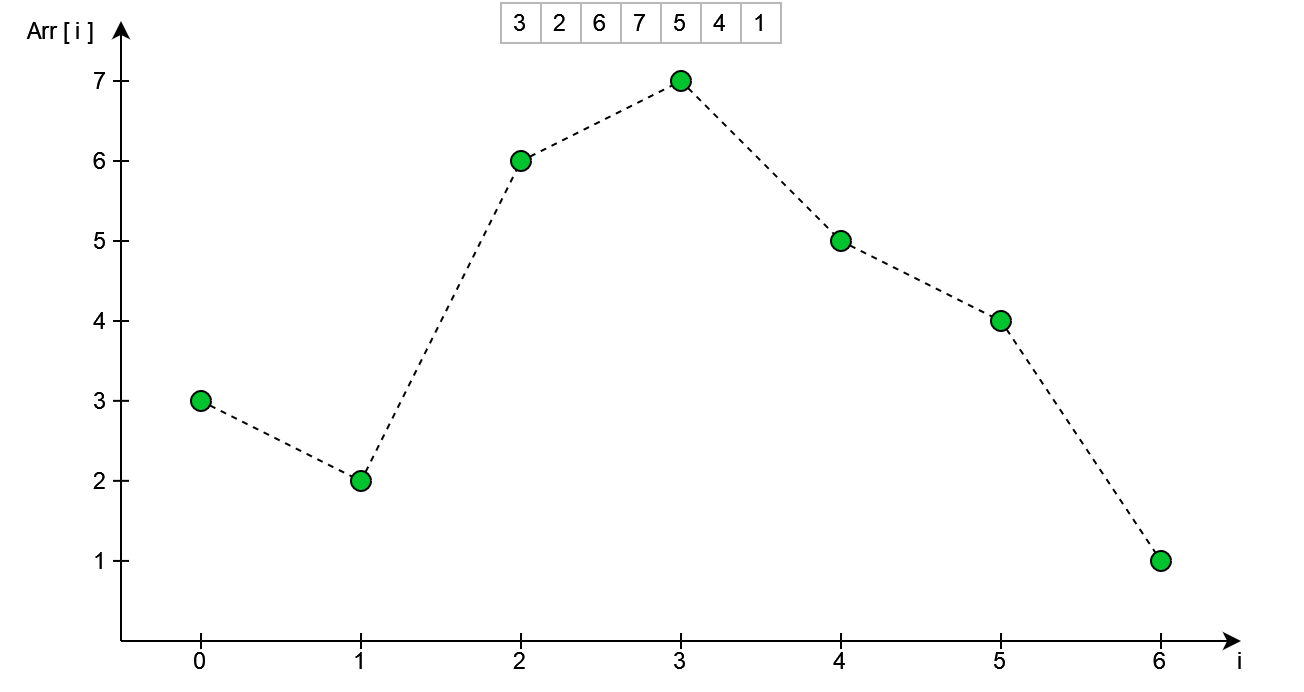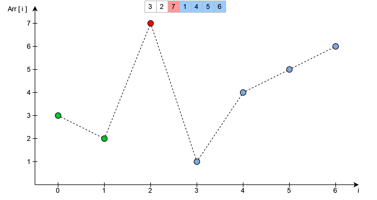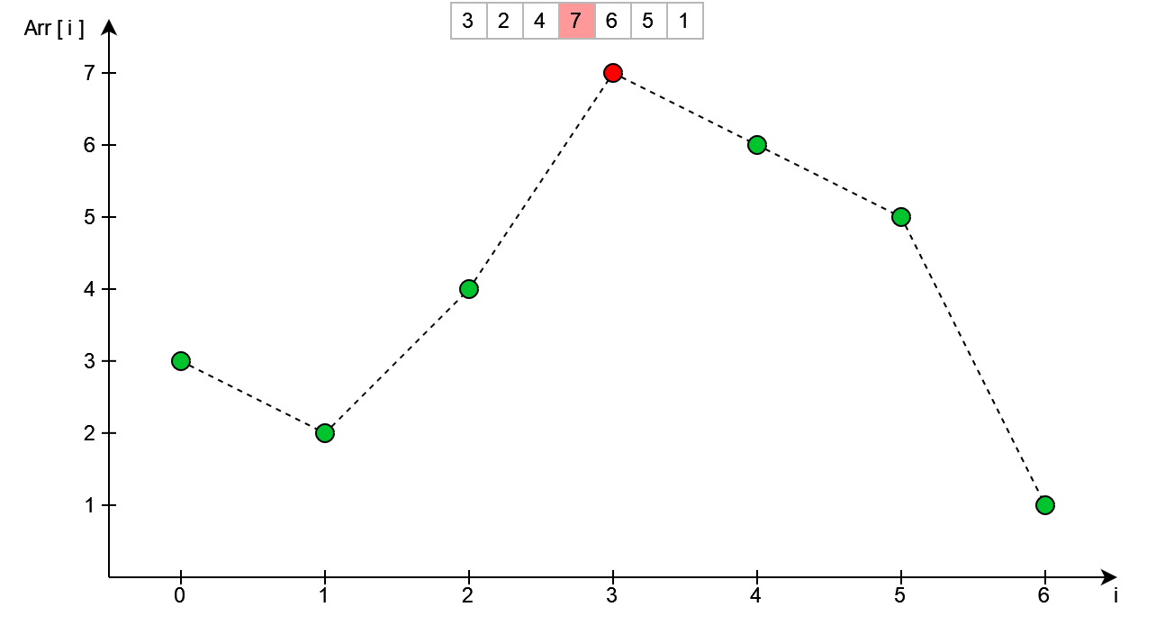 Następnym krokiem jest znalezienie wierzchołka - patrząc z prawej strony. W kodzie wykonane zostanie to przez iterowanie się od końca tablicy do początku - sprawdzając przy tym czy aktualny element jest mniejszy od poprzedniego.