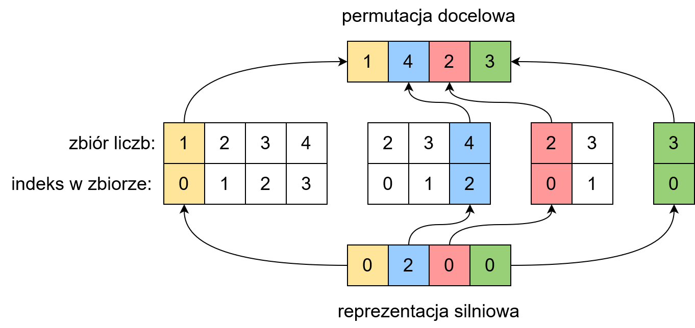 indeks 0 1 2 3Pierwsza liczba w ciągu silniowym to 0, oznacza to, że jako pierwszą cyfrę do docelowej permutacji należy wybrać element na zerowej pozycji z początkowego zbioru liczb. Będzie to 1. Następnie ze zbioru dostępnych elementów usuwamy jedynkę oraz aktualizujemy indeksy. Kolejna cyfra to 2. Oznacza to, że na drugiej pozycji w docelowej permutacji znajdzie się liczba o indeksie 2 ze zbioru dostępnych elementów - jest nią 4. Realizujemy ten algorytm dla pozostałych elementów, tak jak pokazano na poniższym rysunku: