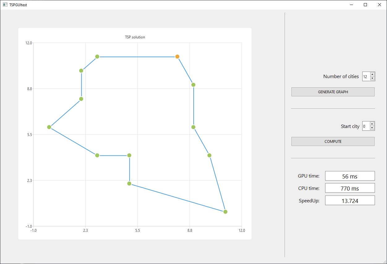 Na podstawie wygenerowanej mapy oraz punktu startowego możemy rozpocząć obliczenia, których rezultat pokazywany jest w formie ścieżki łączącej poszczególne miasta oraz dodatkowo wyświetlana jest informacja o czasach obliczeń dla GPU oraz CPU wraz ze współczynnikiem przyspieszenia.