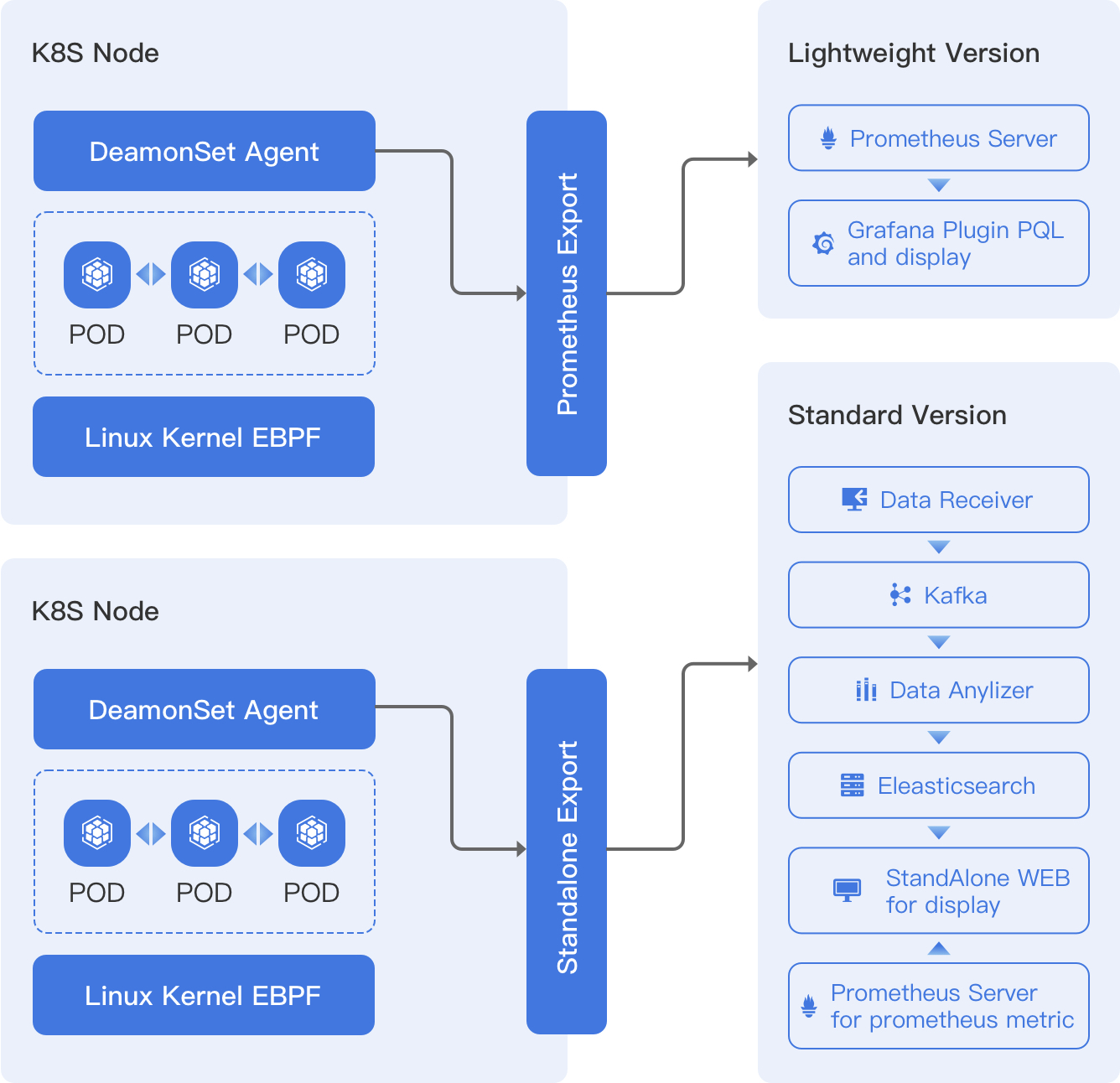 From a high-level view, the agent runs as DeamonSet in Kuberntes. It collects all the SYSCALL and some other tracepoints. We use different exporters for different distributions. For the lightweight version, we just build a Prometheus exporter to export the data which can be stored into Prometheus and displayed in Grafana Plugin. For the standard version, which is designed for heavy usage, Kafka is adopted for buffering the events, and data is stored into ElasticSearch with much more detailed information which can be displayed. Currently, the light version has been open-sourced.